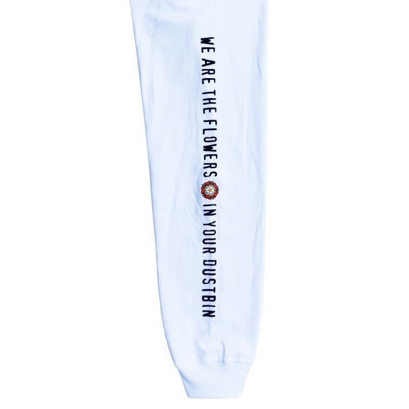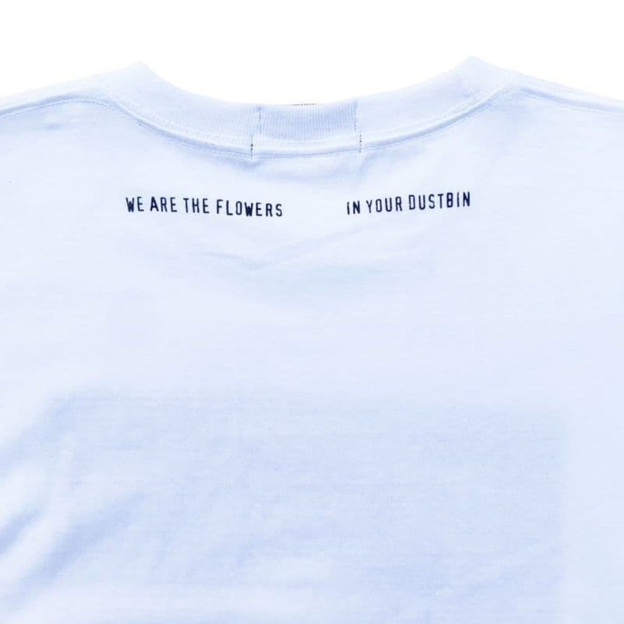 首裏と両袖に"WE ARE THE FLOWERS IN THE DUSTBIN"プリントと"TUDOR ROSE"刺繍。